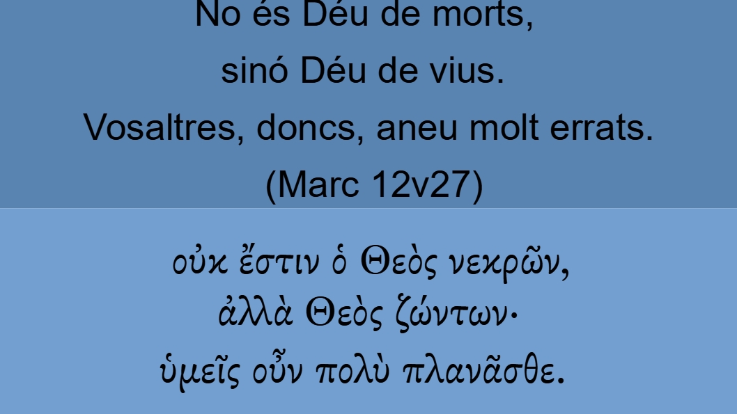 Marc 12v27 No és Déu de morts, sinó Déu de vius. Vosaltres, doncs, aneu molt errats.οὐκ ἔστιν ὁ Θεὸς νεκρῶν, ἀλλὰ Θεὸς ζώντων· ὑμεῖς οὖν πολὺ πλανᾶσθε.God <2316> is <2076> (5748) niet <3756> een God der doden <3498>, maar <235> een God <2316> der levenden <2198> (5723). Gij <5210> dwaalt <4105> (5743) dan <3767> zeer <4183>.GNV Marc 12v27 God is not ye God of the dead, but the God of the liuing. Ye are therefore greatly deceiued.He is <2076> (5748) not <3756> the God <2316> of the dead <3498>, but <235> the God <2316> of the living <2198> (5723): ye <5210> therefore <3767> do <4105> <0> greatly <4183> err <4105> (5743).BCI Marc 12v27 Ell no és Déu de morts, sinó de vius. Aneu molt equivocats!»CCC Marc 12v27 No és Déu de morts, sinó Déu de vius. Vosaltres, doncs, aneu molt errats.
