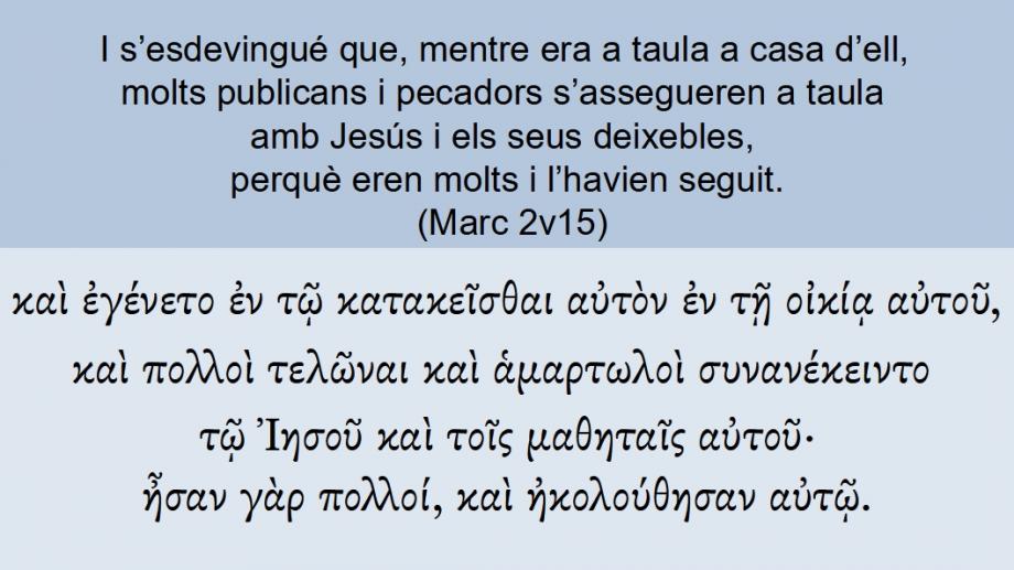 Marc 2v15 I s’esdevingué que, mentre era a taula a casa d’ell, molts publicans i pecadors s’assegueren a taula amb Jesús i els seus deixebles, perquè eren molts i l’havien seguit.καὶ ἐγένετο ἐν τῷ κατακεῖσθαι αὐτὸν ἐν τῇ οἰκίᾳ αὐτοῦ, καὶ πολλοὶ τελῶναι καὶ ἁμαρτωλοὶ συνανέκειντο τῷ Ἰησοῦ καὶ τοῖς μαθηταῖς αὐτοῦ· ἦσαν γὰρ πολλοί, καὶ ἠκολούθησαν αὐτῷ.En <2532> het geschiedde <1096> (5633), als Hij <846> aanzat <2621> (5738) in <1722> deszelfs <846> huis <3614>, dat <1722> ook <2532> vele <4183> tollenaren <5057> en <2532> zondaren <268> aanzaten met <4873> (5711) Jezus <2424> en <2532> Zijn <846> discipelen <3101>; want <1063> zij waren <2258> (5713) velen <4183>, en <2532> waren <190> <0> Hem <846> gevolgd <190> (5656).GNV Marc 2v15 And it came to passe, as Iesus sate at table in his house, many Publicanes and sinners sate at table also with Iesus, and his disciples: for there were many that followed him.And <2532> it came to pass <1096> (5633), that <1722>, as Jesus <846> sat at meat <2621> (5738) in <1722> his <846> house <3614>, many <4183> publicans <5057> and <2532> sinners <268> sat <4873> <0> also <2532> together with <4873> (5711) Jesus <2424> and <2532> his <846> disciples <3101>: for <1063> there were <2258> (5713) many <4183>, and <2532> they followed <190> (5656) him <846>.BCI Marc 2v15 Més tard, es posà a taula a casa d'ell,1 i molts publicans i altres pecadors es posaren també a taula amb Jesús i els seus deixebles;2 eren molts els qui el seguien.CCC Marc 2v15 I s’esdevingué que, mentre era a taula a casa d’ell, molts publicans i pecadors s’assegueren a taula amb Jesús i els seus deixebles, perquè eren molts i l’havien seguit.