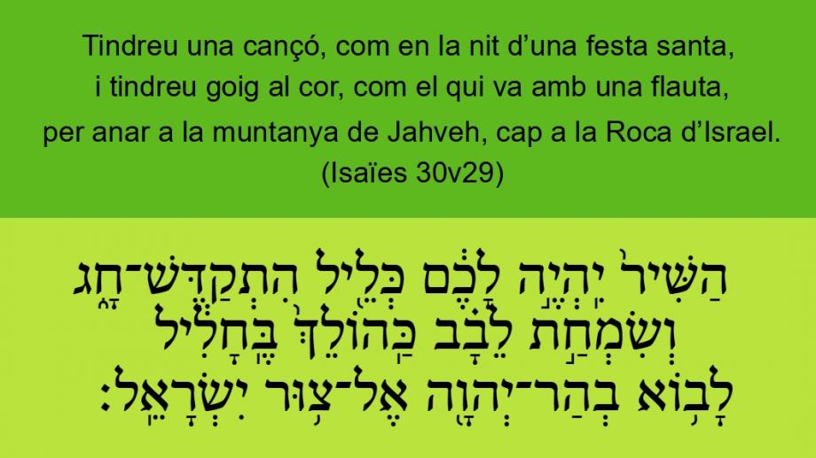 Isaïes 30v29 Tindreu una cançó, com en la nit d’una festa santa, i tindreu goig al cor, com el qui va amb una flauta, per anar a la muntanya de Jahveh, cap a la Roca d’Israel. הַשִּׁיר֙ יִֽהְיֶ֣ה לָכֶ֔ם כְּלֵ֖יל הִתְקַדֶּשׁ־חָ֑ג וְשִׂמְחַ֣ת לֵבָ֗ב כַּֽהוֹלֵךְ֙ בֶּֽחָלִ֔יל לָב֥וֹא בְהַר־יְהוָ֖ה אֶל־צ֥וּר יִשְׂרָאֵֽל׃ Er zal een lofzang <07892> bij ulieden zijn, gelijk in den nacht <03915>, wanneer het feest <02282> geheiligd wordt <06942> (08692); en blijdschap <08057> des harten <03824>, gelijk van een, die met pijpen <02485> wandelt <01980> (08802), om te komen <0935> (08800) tot den berg <02022> des HEEREN <03068>, tot den Rotssteen <06697> van Israel <03478>.GNV Isaïes 30v29 But there shall be a song vnto you as in the night, when solemne feast is kept: and gladnes of heart, as he that commeth with a pipe to goe vnto the mount of the Lord, to the mightie one of Israel.Ye shall have a song <07892>, as in the 1 night <03915> when a holy <06942> <00> solemnity <02282> is kept <06942> (08692); and gladness <08057> of heart <03824>, as when one goeth <01980> (08802) with a pipe <02485> to come <0935> (08800) into the mountain <02022> of the LORD <03068>, to the mighty One <06697> of Israel <03478>.BCI Isaïes 30v29 Mentrestant, vosaltres cantareu com en les vetlles de les grans festes; estareu contents com qui s'encamina, al so de la flauta, cap a la muntanya del Senyor, Roca d'Israel.1CCC Isaïes 30v29 Tindreu una cançó, com en la nit d’una festa santa, i tindreu goig al cor, com el qui va amb una flauta, per anar a la muntanya de Jahveh, cap a la Roca d’Israel.