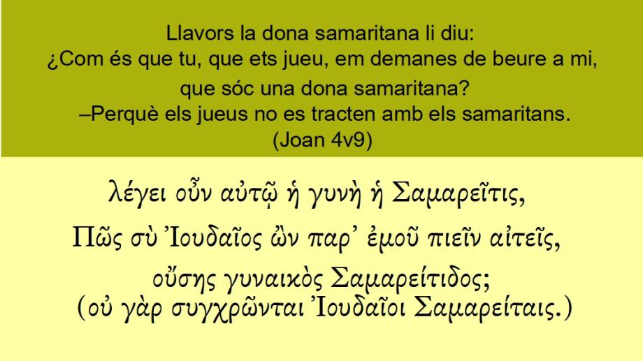 Joan 4v9 Llavors la dona samaritana li diu: ¿Com és que tu, que ets jueu, em demanes de beure a mi, que sóc una dona samaritana? –Perquè els jueus no es tracten amb els samaritans.λέγει οὖν αὐτῷ ἡ γυνὴ ἡ Σαμαρεῖτις, Πῶς σὺ Ἰουδαῖος ὢν παρ᾽ ἐμοῦ πιεῖν αἰτεῖς, οὔσης γυναικὸς Σαμαρείτιδος; (οὐ γὰρ συγχρῶνται Ἰουδαῖοι Σαμαρείταις.)Zo zeide <3004> (5719) dan <3767> de Samaritaanse <4542> vrouw <1135> tot Hem <846>: Hoe <4459> begeert <154> (5719) Gij <4771>, Die een Jood <2453> zijt <5607> (5752), van <3844> mij <1700> te drinken <4095> (5629), die een Samaritaanse <4542> vrouw <1135> ben <5607> (5752)? Want <1063> de Joden <2453> houden <4798> <0> geen <3756> gemeenschap <4798> (5736) met de Samaritanen <4541>.GNV Joan 4v9 Then sayde the woman of Samaria vnto him, Howe is it, that thou being a Iewe, askest drinke of me, which am a woman of Samaria? For the Iewes meddle not with the Samaritans.Then <3767> saith <3004> (5719) the woman <1135> of Samaria <4542> unto him <846>, How is it that <4459> thou <4771>, being <5607> (5752) a Jew <2453>, askest <154> (5719) drink <4095> (5629) of <3844> me <1700>, which am <5607> (5752) a woman <1135> of Samaria <4542>? for <1063> the Jews 1 <2453> have <4798> <0> no <3756> dealings <4798> (5736) with the Samaritans <4541>.BCI Joan 4v9 Però la dona samaritana preguntà a Jesús: «Com és que tu, que ets jueu, em demanes aigua a mi, que sóc samaritana?» Cal recordar que els jueus no es fan amb els samaritans.1CCC Joan 4v9 Llavors la dona samaritana li diu: ¿Com és que tu, que ets jueu, em demanes de beure a mi, que sóc una dona samaritana? –Perquè els jueus no es tracten amb els samaritans.