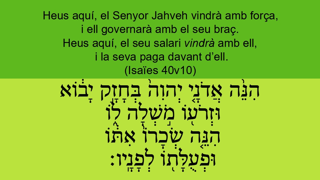 Isaïes 40v10 Heus aquí, el Senyor Jahveh vindrà amb força, i ell governarà amb el seu braç. Heus aquí, el seu salari vindrà amb ell, i la seva paga davant d’ell.הִנֵּ֙ה אֲדֹנָ֤י יְהוִה֙ בְּחָזָ֣ק יָב֔וֹא וּזְרֹע֖וֹ מֹ֣שְׁלָה ל֑וֹ הִנֵּ֤ה שְׂכָרוֹ֙ אִתּ֔וֹ וּפְעֻלָּת֖וֹ לְפָנָֽיו׃ Ziet, de Heere <0136> HEERE <03069> zal komen <0935> (08799) tegen den sterke <02389>, en Zijn arm <02220> zal heersen <04910> (08802); ziet, Zijn loon <07939> is bij Hem, en Zijn arbeidsloon <06468> is voor Zijn aangezicht <06440>.GNV Isaïes 40v10 Beholde, the Lord God will come with power, and his arme shall rule for him: beholde, his rewarde is with him, and his worke before him,Behold, the Lord <0136> GOD <03069> will come <0935> (08799) with strong <02389> hand, and 1 his arm <02220> shall rule <04910> (08802) for him: behold, his reward <07939> is with him, and his work <06468> before <06440> him.{ TrNotes: with strong...: or, against the strongBCI Isaïes 40v10 El Senyor Déu, arriba amb poder, amb la força del seu braç domina tota cosa. L'acompanya el fruit de la seva victòria, el precedeixen els seus trofeus.1CCC Isaïes 40v10 Heus aquí, el Senyor Jahveh vindrà amb força, i ell governarà amb el seu braç. Heus aquí, el seu salari vindrà amb ell, i la seva paga davant d’ell.