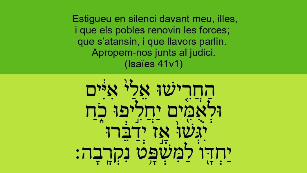 Isaïes 41v1 Estigueu en silenci davant meu, illes, i que els pobles renovin les forces; que s’atansin, i que llavors parlin. Apropem-nos junts al judici. הַחֲרִ֤ישׁוּ אֵלַי֙ אִיִּ֔ים וּלְאֻמִּ֖ים יַחֲלִ֣יפוּ כֹ֑חַ יִגְּשׁוּ֙ אָ֣ז יְדַבֵּ֔רוּ יַחְדָּ֖ו לַמִּשְׁפָּ֥ט נִקְרָֽבָה׃ Zwijgt <02790> (08685) voor Mij, gij eilanden <0339>! en laat de volken <03816> de kracht <03581> vernieuwen <02498> (08686); laat ze toetreden <05066> (08799), laat ze dan spreken <01696> (08762); laat ons samen <03162> ten gerichte <04941> naderen <07126> (08799).GNV Isaïes 41v1 Keep silence before mee, O ylands, and let the people renue their strength: let the come neere, and let them speake: let vs come together into iudgement.Keep 1 silence <02790> (08685) before me, O islands <0339>; and let the people 2 <03816> renew <02498> (08686) their strength <03581>: let them come near <05066> (08799); then let them speak <01696> (08762): let us come near <07126> (08799) together <03162> to judgment <04941>.BCI Isaïes 41v1 «Estigueu en silenci davant meu, els qui viviu lluny, a les illes. Nacions, revestiu-vos de coratge. Apropeu-vos, i després parlareu. Compareguem tots junts a judici!1CCC Isaïes 41v1 Estigueu en silenci davant meu, illes, i que els pobles renovin les forces; que s’atansin, i que llavors parlin. Apropem-nos junts al judici.