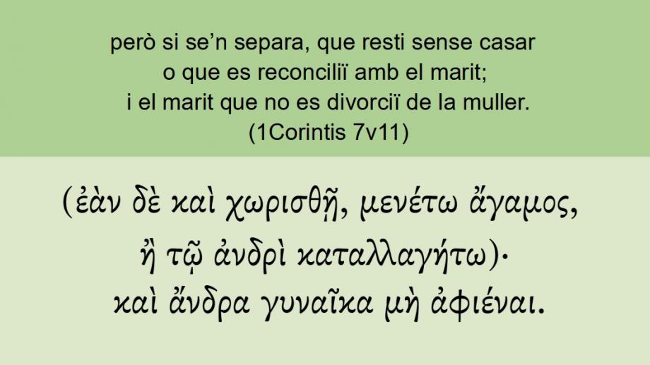 1a Corintis 7v11 però si se’n separa, que resti sense casar o que es reconciliï amb el marit; i el marit que no es divorciï de la muller.(ἐὰν δὲ καὶ χωρισθῇ, μενέτω ἄγαμος, ἢ τῷ ἀνδρὶ καταλλαγήτω)· καὶ ἄνδρα γυναῖκα μὴ ἀφιέναι.SVV 1a Corintis 7v11 En <1161> indien <1437> zij ook <2532> scheidt <5563> (5681), dat zij ongetrouwd <22> blijve <3306> (5720), of <2228> met den man <435> verzoene <2644> (5649); en <2532> dat de man <435> de vrouw <1135> niet <3361> verlate <863> (5721).GNV 1a Corintis 7v11 But and if shee depart, let her remaine vnmaried, or be reconciled vnto her husband, and let not the husband put away his wife.But <1161> and <2532> if <1437> she depart <5563> (5681), let her remain <3306> (5720) unmarried <22>, or <2228> be reconciled <2644> (5649) to her husband <435>: and <2532> let <863> <0> not <3361> the husband <435> put away <863> (5721) his wife <1135>.BCI 1a Corintis 7v11 i si se'n separa, que no es torni a casar o bé que es reconciliï amb el seu marit; i l'home no ha de deixar la seva muller.1CCC 1a Corintis 7v11 però si se’n separa, que resti sense casar o que es reconciliï amb el marit; i el marit que no es divorciï de la muller.