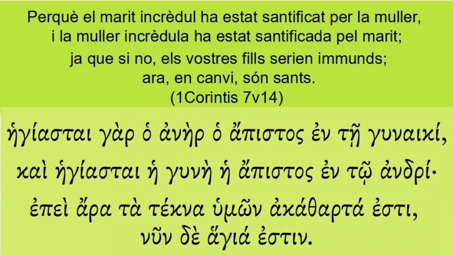 1a Corintis 7v14 Perquè el marit incrèdul ha estat santificat per la muller, i la muller incrèdula ha estat santificada pel marit; ja que si no, els vostres fills serien immunds; ara, en canvi, són sants. ἡγίασται γὰρ ὁ ἀνὴρ ὁ ἄπιστος ἐν τῇ γυναικί, καὶ