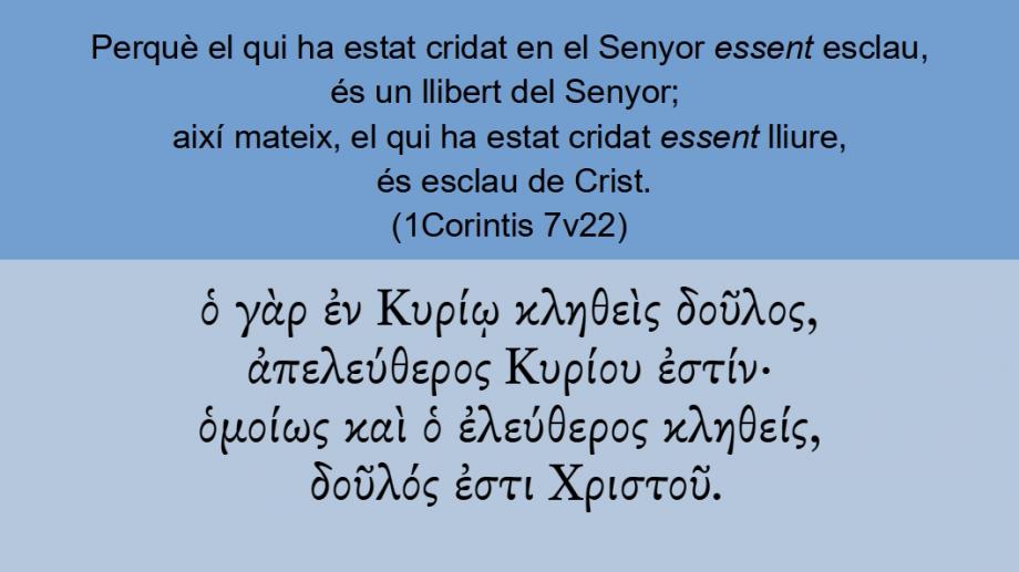 1a Corintis 7v22 Perquè el qui ha estat cridat en el Senyor essent esclau, és un llibert del Senyor; així mateix, el qui ha estat cridat essent lliure, és esclau de Crist.ὁ γὰρ ἐν Κυρίῳ κληθεὶς δοῦλος, ἀπελεύθερος Κυρίου ἐστίν· ὁμοίως καὶ ὁ ἐλεύθερος κληθείς, δοῦλός ἐστι Χριστοῦ.Want <1063> die in <1722> den Heere <2962> geroepen is <2564> (5685), een dienstknecht <1401> zijnde, die is <2076> (5748) een vrijgelatene <558> des Heeren <2962>; desgelijks <3668> ook <2532>, die vrij <1658> zijnde geroepen is <2564> (5685), die is <2076> (5748) een dienstknecht <1401> van Christus <5547>.GNV 1a Corintis 7v22 For he that is called in the Lord, being. a seruant, is the Lords freeman: likewise also he that is called being free, is Christes seruant.For <1063> he that is called <2564> (5685) in <1722> the 1 Lord <2962>, being a servant <1401>, is <2076> (5748) the Lord's <2962> freeman <558>: likewise <3668> also <2532> he that is called <2564> (5685), being free <1658>, is <2076> (5748) Christ's <5547> servant <1401>.BCI 1a Corintis 7v22 Perquè l'esclau que ha estat cridat a ser del Senyor és un llibert del Senyor. Igualment, el qui ha estat cridat essent lliure és un esclau de Crist.1CCC 1a Corintis 7v22 Perquè el qui ha estat cridat en el Senyor essent esclau, és un llibert del Senyor; així mateix, el qui ha estat cridat essent lliure, és esclau de Crist.