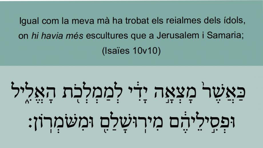 Isaïes 10v10 Igual com la meva mà ha trobat els reialmes dels ídols, on hi havia més escultures que a Jerusalem i Samaria; WTT Isaïes 10v10 כַּאֲשֶׁר֙ מָצְאָ֣ה יָדִ֔י לְמַמְלְכֹ֖ת הָאֱלִ֑יל וּפְסִ֣ילֵיהֶ֔ם מִירֽוּשָׁלִַ֖ם וּמִשֹּׁמְרֽוֹן׃ SVV Isaïes 10v10 Gelijk als mijn hand <03027> gevonden heeft <04672> (08804) de koninkrijken <04467> der afgoden <0457>, ofschoon hun gesneden beelden <06456> beter zijn, dan die van Jeruzalem <03389>, en dan die van Samaria <08111>;GNV Isaïes 10v10 Like as mine hand hath founde the kingdomes of the idoles, seeing their idoles were aboue Ierusalem, and aboue Samaria:As my hand <03027> hath found <04672> (08804) the kingdoms <04467> of the idols <0457>, and whose graven images <06456> did excel them of Jerusalem <03389> and of Samaria <08111>;BCI Isaïes 10v10 He sotmès amb el meu poder regnes protegits per molts ídols, amb moltes més estàtues que Jerusalem i Samaria.CCC Isaïes 10v10 Igual com la meva mà ha trobat els reialmes dels ídols, on hi havia més escultures que a Jerusalem i Samaria;