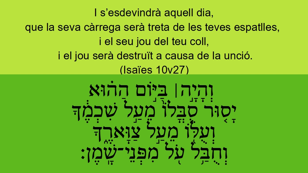 Isaïes 10v27 I s’esdevindrà aquell dia, que la seva càrrega serà treta de les teves espatlles, i el seu jou del teu coll, i el jou serà destruït a causa de la unció.WTT Isaïes 10v27 וְהָיָ֣ה׀ בַּיּ֣וֹם הַה֗וּא יָס֤וּר סֻבֳּלוֹ֙ מֵעַ֣ל שִׁכְמֶ֔ךָ וְעֻלּ֖וֹ מֵעַ֣ל צַוָּארֶ֑ךָ וְחֻבַּ֥ל עֹ֖ל מִפְּנֵי־שָֽׁמֶן׃ SVV Isaïes 10v27 En het zal geschieden ten zelfden dage <03117>, dat zijn last <05448> zal afwijken <05493> (08799) van uw schouder <07926>, en zijn juk <05923> van uw hals <06677>; en het juk <05923> zal verdorven worden <02254> (08795), om <06440> des Gezalfden <08081> wil.GNV Isaïes 10v27 And at that day shall his burden be taken away from off thy shoulder, and his yoke from off thy necke: and the yoke shalbe destroied because of the anoynting. And it shall come to pass in that day <03117>, that his burden <05448> shall be taken away <05493> (08799) from off thy shoulder <07926>, and his yoke <05923> from off thy neck <06677>, and the yoke <05923> shall be destroyed <02254> (08795) because <06440> of 1 the anointing <08081>.BCI Isaïes 10v27 Aquell dia, et traurà la càrrega de les espatlles i el jou que duus al coll.1 I seràs tan fort que ja no et podran enjovar.»CCC Isaïes 10v27 I s’esdevindrà aquell dia, que la seva càrrega serà treta de les teves espatlles, i el seu jou del teu coll, i el jou serà destruït a causa de la unció.