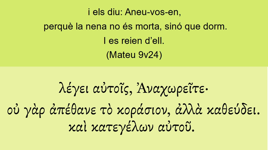 Mateu 9v24 i els diu: Aneu-vos-en, perquè la nena no és morta, sinó que dorm. I es reien d’ell. λέγει αὐτοῖς, Ἀναχωρεῖτε· οὐ γὰρ ἀπέθανε τὸ κοράσιον, ἀλλὰ καθεύδει. καὶ κατεγέλων αὐτοῦ.SVV  Mateu 9v24 Zeide Hij <3004> (5719) tot hen <846>: Vertrekt <402> (5720); want <1063> het dochtertje <2877> is niet <3756> dood <599> (5627), maar <235> slaapt <2518> (5719). En <2532> zij belachten <2606> (5707) Hem <846>.GNV  Mateu 9v24 He said vnto them, Get you hence: for the maid is not dead, but sleepeth. And they laughed him to scorne.He said <3004> (5719) unto them <846>, Give place <402> (5720): for <1063> the maid <2877> is <599> <0> not <3756> dead <599> (5627), but <235> sleepeth <2518> (5719). And <2532> they laughed <2606> <0> him <846> to scorn <2606> (5707).BCI  Mateu 9v24 va dir: «Aparteu-vos: la noia no és morta, sinó que dorm.»1 Però ells es burlaven de Jesús.CCC  Mateu 9v24 i els diu: Aneu-vos-en, perquè la nena no és morta, sinó que dorm. I es reien d’ell.