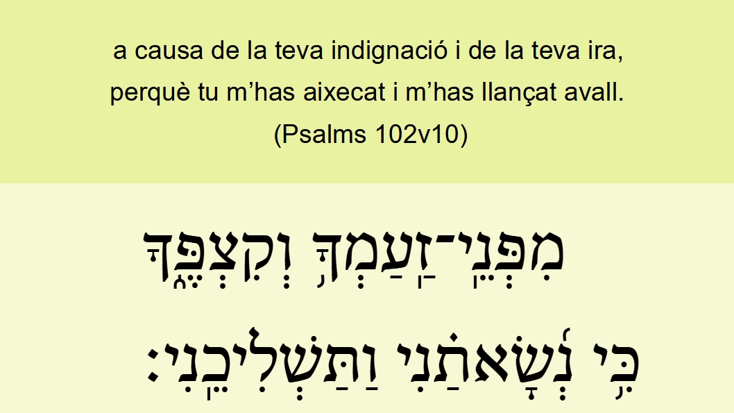Psalms 102v10 a causa de la teva indignació i de la teva ira, perquè tu m’has aixecat i m’has llançat avall.  מִפְּנֵֽי־זַֽעַמְךָ֥ וְקִצְפֶּ֑ךָ כִּ֥י נְ֜שָׂאתַ֗נִי וַתַּשְׁלִיכֵֽנִי׃   SVV  Psalms 102v10 (0102v11) Vanwege <06440> Uw verstoordheid <02195>