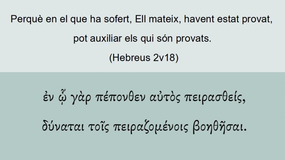 Hebreus 2v18 Perquè en el que ha sofert, ell mateix, havent estat provat, pot auxiliar els qui són provats.ἐν ᾧ γὰρ πέπονθεν αὐτὸς πειρασθείς, δύναται τοῖς πειραζομένοις βοηθῆσαι.Want <1063> in <1722> hetgeen <3739> Hij Zelf <846>, verzocht zijnde <3985> (5685), geleden heeft <3958> (5754), kan Hij <1410> (5736) dengenen, die verzocht worden <3985> (5746), te hulp komen <997> (5658).GNV  Hebreus 2v18 For in that he suffered, and was tempted, he is able to succour them that are tempted.For <1063> in <1722> that <3739> he <3958> <0> himself <846> hath suffered <3958> (5754) being 1 tempted <3985> (5685), he is able <1410> (5736) to succour <997> (5658) them that are tempted <3985> (5746).BCI  Hebreus 2v18 I havent passat ell mateix la prova del sofriment, ara pot ajudar els qui són provats.1CCC  Hebreus 2v18 Perquè en el que ha sofert, ell mateix, havent estat provat, pot auxiliar els qui són provats.