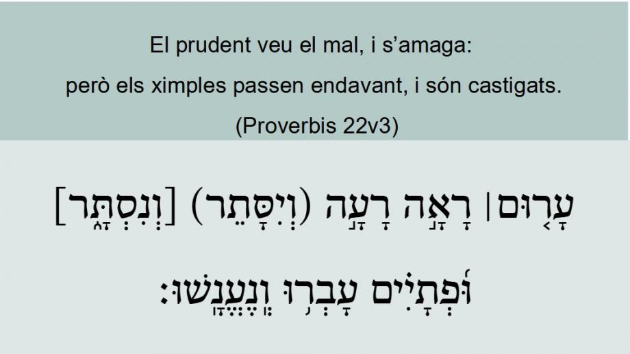 Proverbis 22v3 El prudent veu el mal, i s’amaga: però els ximples passen endavant, i són castigats. עָר֤וּם׀ רָאָ֣ה רָעָ֣ה (וְיִסָּתֵר) [וְנִסְתָּ֑ר] וּ֜פְתָיִ֗ים עָבְר֥וּ וְֽנֶעֱנָֽשׁוּ׃ SVV Proverbis 22v3 Een kloekzinnig <06175> mens ziet <07200> (08804) het kwaad <07451>, en verbergt zich <05641> (08738) (08675) <05641> (08799); maar de slechten <06612> gaan henen door <05674> (08804), en worden gestraft <06064> (08738).GNV Proverbis 22v3 A prudent man seeth the plague, and hideth himselfe: but the foolish goe on still, and are punished.A prudent <06175> man 1 foreseeth <07200> (08804) the evil <07451>, and hideth <05641> (08738) (08675) <05641> (08799) himself: but the simple <06612> pass on <05674> (08804), and are punished <06064> (08738).BCI Proverbis 22v3 L'astut veu venir la malvestat i s'aixopluga, però l'incaut continua enllà i ho paga car.1CCC Proverbis 22v3 El prudent veu el mal, i s’amaga: però els ximples passen endavant, i són castigats.