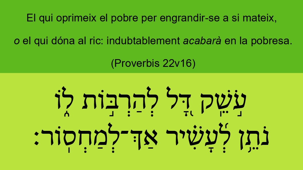 Proverbis 22v16 El qui oprimeix el pobre per engrandir-se a si mateix, o el qui dóna al ric: indubtablement acabarà en la pobresa. עֹ֣שֵֽׁק דָּ֭ל לְהַרְבּ֣וֹת ל֑וֹ נֹתֵ֥ן לְ֜עָשִׁ֗יר אַךְ־לְמַחְסֽוֹר׃Die den arme <01800> verdrukt <06231> (08802), om het zijne te vermeerderen <07235> (08687), en den rijke <06223> geeft <05414> (08802), komt zekerlijk tot gebrek <04270>.GNV Proverbis 22v16 Hee that oppresseth the poore to increase him selfe, and giueth vnto the riche, shall surely come to pouertie.He that oppresseth <06231> (08802) the poor <01800> to increase <07235> (08687) his riches, and he that giveth <05414> (08802) to the rich <06223>, shall surely come to want <04270>.BCI Proverbis 22v16 Qui oprimeix el pobre, al final el veurà ric; qui dóna al ric, segur que s'empobrirà.CCC Proverbis 22v16 El qui oprimeix el pobre per engrandir-se a si mateix, o el qui dóna al ric: indubtablement acabarà en la pobresa.