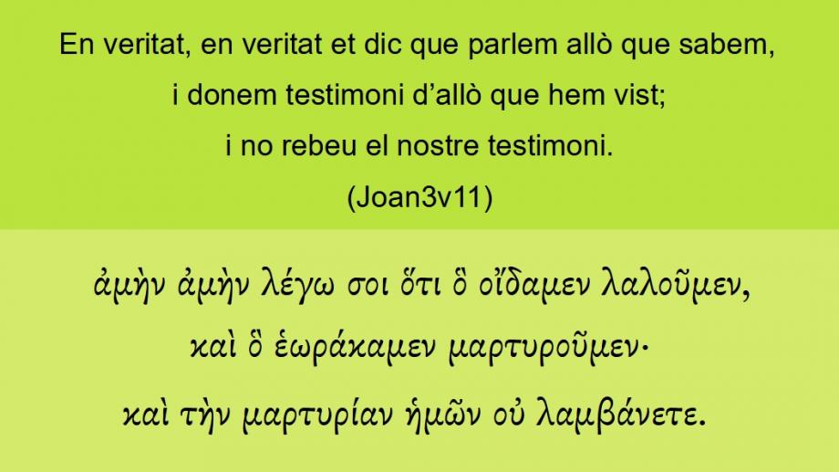 Joan 3v11 En veritat, en veritat et dic que parlem allò que sabem, i donem testimoni d’allò que hem vist; i no rebeu el nostre testimoni.  ἀμὴν ἀμὴν λέγω σοι ὅτι ὃ οἴδαμεν λαλοῦμεν, καὶ ὃ ἑωράκαμεν μαρτυροῦμεν· καὶ τὴν μαρτυρίαν ἡμῶν οὐ λαμβάνετε. SVV