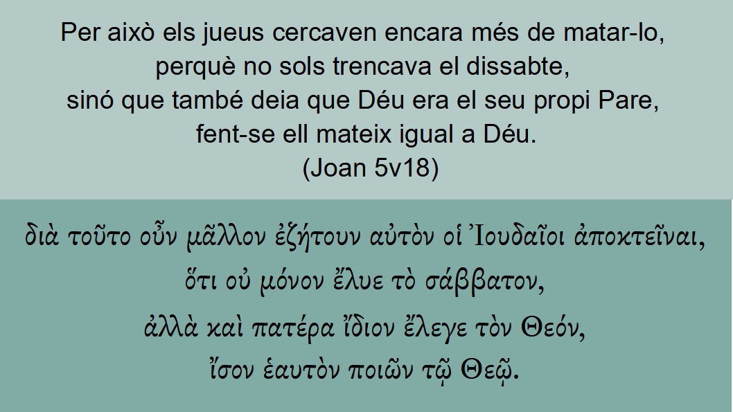 Joan 5v18 Per això els jueus cercaven encara més de matar-lo, perquè no sols trencava el dissabte, sinó que també deia que Déu era el seu propi Pare, fent-se ell mateix igual a Déu. διὰ τοῦτο οὖν μᾶλλον ἐζήτουν αὐτὸν οἱ Ἰουδαῖοι ἀποκτεῖναι, ὅτι οὐ μόνον ἔλυε τὸ σάββατον, ἀλλὰ καὶ πατέρα ἴδιον ἔλεγε τὸν Θεόν, ἴσον ἑαυτὸν ποιῶν τῷ Θεῷ.SVV Joan 5v18 Daarom <1223> <5124> zochten <2212> (5707) dan <3767> de Joden <2453> te meer <3123> Hem <846> te doden <615> (5658), omdat <3754> Hij niet <3756> alleen <3440> den sabbat <4521> brak <3089> (5707), maar <235> ook <2532> zeide <3004> (5707), dat God <2316> Zijn eigen <2398> Vader <3962> was, Zichzelven <1438> Gode <2316> evengelijk <2470> makende <4160> (5723).GNV Joan 5v18 Therefore the Iewes sought the more to kill him: not onely because he had broken the Sabbath: but said also that God was his Father, and made himselfe equall with God.Therefore <1223> <5124> <3767> the Jews <2453> sought <2212> (5707) the more <3123> to kill <615> (5658) him <846>, because <3754> he <3089> <0> not <3756> only <3440> had broken <3089> (5707) the sabbath <4521>, but <235> said <3004> (5707) also <2532> that God <2316> was 1 his <2398> Father <3962>, making <4160> (5723) himself <1438> equal <2470> with God <2316>.BCI Joan 5v18 Davant d'això, els jueus, amb més afany, buscaven de matar-lo,1 perquè veien que, a més de violar el repòs del dissabte, afirmava que Déu era el seu Pare i es feia així igual a Déu.2CCC Joan 5v18 Per això els jueus cercaven encara més de matar-lo, perquè no sols trencava el dissabte, sinó que també deia que Déu era el seu propi Pare, fent-se ell mateix igual a Déu.