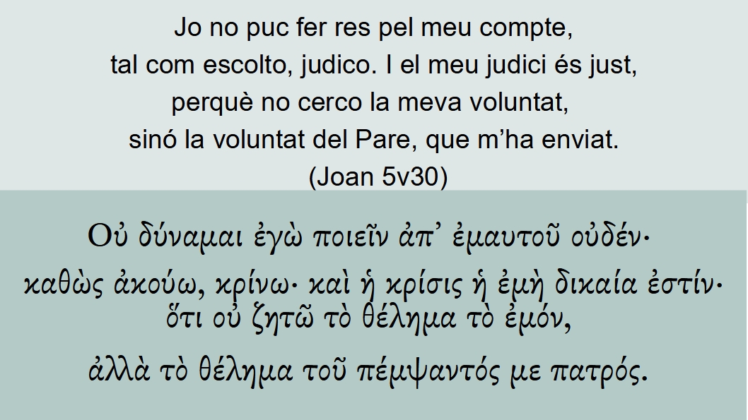 Joan 5v30 Jo no puc fer res pel meu compte, tal com escolto, judico. I el meu judici és just, perquè no cerco la meva voluntat, sinó la voluntat del Pare, que m’ha enviat.Οὐ δύναμαι ἐγὼ ποιεῖν ἀπ᾽ ἐμαυτοῦ οὐδέν· καθὼς ἀκούω, κρίνω· καὶ ἡ κρίσις ἡ ἐμὴ δικαία ἐστίν· ὅτι οὐ ζητῶ τὸ θέλημα τὸ ἐμόν, ἀλλὰ τὸ θέλημα τοῦ πέμψαντός με πατρός.SVV Joan 5v30 Ik <1473> kan <1410> (5736) van <575> Mijzelven <1683> niets <3756> <3762> doen <4160> (5721). Gelijk <2531> Ik hoor <191> (5719), oordeel Ik <2919> (5719), en <2532> Mijn <1699> oordeel <2920> is <2076> (5748) rechtvaardig <1342>; want <3754> Ik zoek <2212> (5719) niet <3756> Mijn <1699> wil <2307>, maar <235> den wil <2307> des Vaders <3962>, Die <3739> Mij <3165> gezonden heeft <3992> (5660).GNV Joan 5v30 I can doe nothing of mine owne selfe: as I heare, I iudge: and my iudgement is iust, because I seeke not mine owne will, but the will of the Father who hath sent me. I <1473> can 2 <1410> (5736) of <575> mine own self <1683> do <4160> (5721) nothing: 3 <3756> <3762> as <2531> I hear <191> (5719), I judge <2919> (5719): and <2532> my <1699> judgment <2920> is <2076> (5748) just <1342>; because <3754> I seek <2212> (5719) not <3756> mine own <1699> will <2307>, but <235> the will <2307> of the Father <3962> which hath sent <3992> (5660) me <3165>.BCI Joan 5v30 Jo no puc fer res pel meu compte: judico segons allò que sento, i el meu judici és just, perquè no busco de fer la meva pròpia voluntat, sinó la voluntat del qui m'ha enviat.1CCC Joan 5v30 Jo no puc fer res pel meu compte, tal com escolto, judico. I el meu judici és just, perquè no cerco la meva voluntat, sinó la voluntat del Pare, que m’ha enviat.