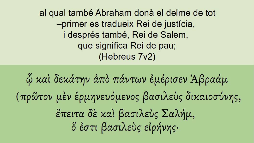 Hebreus 7v2 al qual també Abraham donà el delme de tot –primer es tradueix Rei de justícia, i després també, Rei de Salem, que significa Rei de pau;ᾧ καὶ δεκάτην ἀπὸ πάντων ἐμέρισεν Ἀβραάμ (πρῶτον μὲν ἑρμηνευόμενος βασιλεὺς δικαιοσύνης, ἔπειτα δὲ καὶ βασιλεὺς Σαλήμ, ὅ ἐστι βασιλεὺς εἰρήνης·Aan welken <3739> ook <2532> Abraham <11> van <575> alles <3956> de tienden <1181> deelde <3307> (5656); die vooreerst <4412> <3303> overgezet wordt <2059> (5746), koning <935> der gerechtigheid <1343>, en <1161> daarna <1899> ook <2532> was een koning <935> van Salem <4532>, hetwelk <3603> is <2076> (5748) een koning <935> des vredes <1515>;GNV Hebreus 7v2 To whom also Abraham gaue the tithe of all things: who first is by interpretation King of righteousnes: after that, he is also King of Salem, that is, King of peace, To whom <3739> also <2532> Abraham <11> gave <3307> (5656) a tenth part <1181> of <575> all <3956>; first <4412> <3303> being by interpretation <2059> (5746) King <935> of righteousness <1343>, and <1161> after that <1899> also <2532> King <935> of Salem <4532>, which is <3603> (5748), King <935> of peace <1515>;BCI Hebreus 7v2 i Abraham li va donar la desena part de tot el botí.1 Melquisedec, si traduïm el seu nom, era «rei de justícia»; i era també rei de Salem, és a dir, «rei de pau».CCC Hebreus 7v2 al qual també Abraham donà el delme de tot –primer es tradueix Rei de justícia, i després també, Rei de Salem, que significa Rei de pau;