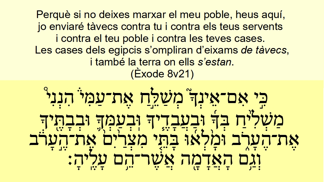 Èxode 8v21 Perquè si no deixes marxar el meu poble, heus aquí, jo enviaré tàvecs contra tu i contra els teus servents i contra el teu poble i contra les teves cases. Les cases dels egipcis s’ompliran d’eixams de tàvecs, i també la terra on ells s’estan.Èxode 8v17 כִּ֣י אִם־אֵינְךָ֮ מְשַׁלֵּ֣חַ אֶת־עַמִּי֒ הִנְנִי֩ מַשְׁלִ֙יחַ בְּךָ֜ וּבַעֲבָדֶ֧יךָ וּֽבְעַמְּךָ֛ וּבְבָתֶּ֖יךָ אֶת־הֶעָרֹ֑ב וּמָ֙לְא֜וּ בָּתֵּ֤י מִצְרַ֙יִם֙ אֶת־הֶ֣עָרֹ֔ב וְגַ֥ם הָאֲדָמָ֖ה אֲשֶׁר־הֵ֥ם עָלֶֽיהָ׃ SVV Èxode 8v21 Want zo gij Mijn volk <05971> niet laat trekken <07971> (08764), zie, zo zal Ik een vermenging <06157> van ongedierte zenden <07971> (08688) op u, en op uw knechten <05650>, en op uw volk <05971>, en in uw huizen <01004>; alzo dat de huizen <01004> der Egyptenaren <04714> met deze vermenging <06157> zullen vervuld worden <04390> (08804), en ook het aardrijk <0127>, waarop zij zijn.GNV Èxode 8v21 Els, if thou wilt not let my people goe, behold, I will send swarmes of flies both vpon thee, and vpon thy seruants, and vpon thy people, and into thine houses: and the houses of the Egyptians shalbe full of swarmes of flies, and the ground also whereon they are.Else, if thou wilt not let my people <05971> go <07971> (08764), behold, I will send <07971> (08688) swarms <06157> of flies upon thee, and upon thy servants <05650>, and upon thy people <05971>, and into thy houses <01004>: and the houses <01004> of the Egyptians <04714> shall be full <04390> (08804) of swarms <06157> of flies, and also the ground <0127> whereon they are.BCI Èxode 8v17 Si no el deixes sortir, jo enviaré una invasió de tàvecs sobre tu, sobre els teus cortesans i sobre el teu poble. Es ficaran fins i tot dintre les cases. Les cases i tota la terra d'Egipte quedaran plenes de tàvecs;CCC Èxode 8v21 Perquè si no deixes marxar el meu poble, heus aquí, jo enviaré tàvecs contra tu i contra els teus servents i contra el teu poble i contra les teves cases. Les cases dels egipcis s’ompliran d’eixams de tàvecs, i també la terra on ells s’estan.