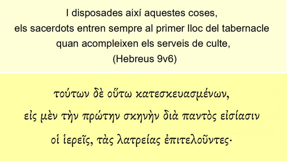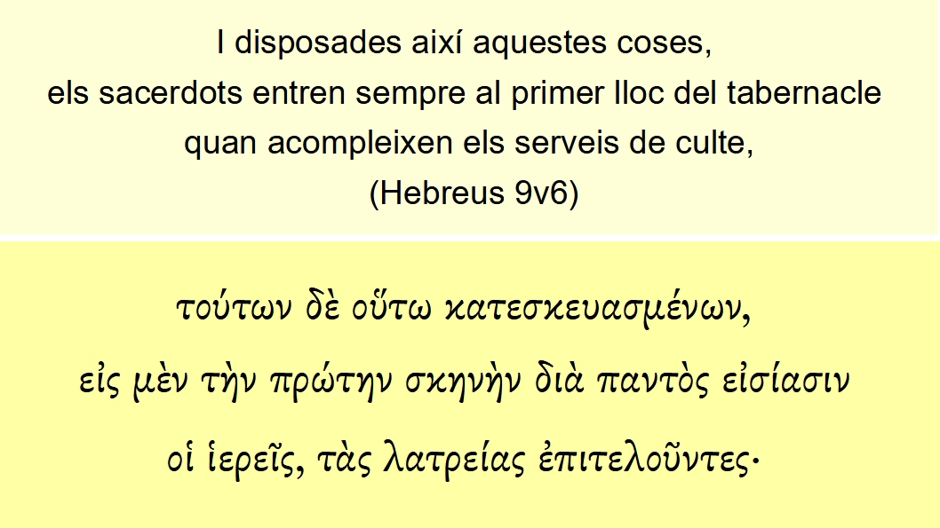 Hebreus 9v6 I disposades així aquestes coses, els sacerdots entren sempre al primer lloc del tabernacle quan acompleixen els serveis de culte, τούτων δὲ οὕτω κατεσκευασμένων, εἰς μὲν τὴν πρώτην σκηνὴν διὰ παντὸς εἰσίασιν οἱ ἱερεῖς, τὰς λατρείας ἐπιτελοῦντες·Deze dingen nu, aldus toebereid zijnde, zo gingen wel de priesters in den eersten tabernakel, te allen tijde, om de gods diensten te volbrengen;GNV Hebreus 9v6 Nowe when these things were thus ordeined, the Priestes went alwayes into the first Tabernacle, and accomplished the seruice. Now when these things were thus ordained, the priests went always into the first tabernacle, accomplishing the service of God.BCI Hebreus 9v6 Disposat tot tal com hem dit, els sacerdots entren1 sempre que cal a la primera estança del tabernacle per dur-hi a terme les funcions del culte,2CCC Hebreus 9v6 I disposades així aquestes coses, els sacerdots entren sempre al primer lloc del tabernacle quan acompleixen els serveis de culte,