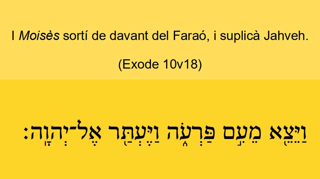 Èxode 10v18 I Moisès sortí de davant del Faraó, i suplicà Jahveh. וַיֵּצֵ֖א מֵעִ֣ם פַּרְעֹ֑ה וַיֶּעְתַּ֖ר אֶל־יְהוָֽה׃ En hij ging uit van Farao, en bad vuriglijk tot den HEERE.GNV Èxode 10v18 Moses then went out from Pharaoh, and prayed vnto the Lord. And he went out from Pharaoh, and intreated the LORD.BCI Èxode 10v18 Moisès va sortir de davant del faraó i va pregar al Senyor.CCC Èxode 10v18 I Moisès sortí de davant del Faraó, i suplicà Jahveh.