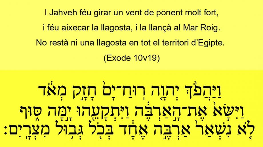 Èxode 10v19 I Jahveh féu girar un vent de ponent molt fort, i féu aixecar la llagosta, i la llançà al Mar Roig. No restà ni una llagosta en tot el territori d’Egipte. וַיַּהֲפֹ֙ךְ יְהוָ֤ה רֽוּחַ־יָם֙ חָזָ֣ק מְאֹ֔ד וַיִּשָּׂא֙ אֶת־הָ֣אַרְבֶּ֔ה וַיִּתְקָעֵ֖הוּ יָ֣מָּה סּ֑וּף לֹ֤א נִשְׁאַר֙ אַרְבֶּ֣ה אֶחָ֔ד בְּכֹ֖ל גְּב֥וּל מִצְרָֽיִם׃ SVV Èxode 10v19 Toen keerde de HEERE een zeer sterken westenwind, die hief de sprinkhanen op, en wierp ze in de Schelfzee; er bleef niet een sprinkhaan over in al de landpalen van Egypte.GNV Èxode 10v19 And the Lord turned a mightie strong West winde, and tooke away the grashoppers, and violently cast them into the red Sea, so that there remained not one grashopper in all the coast of Egypt.And the LORD turned a mighty strong west wind, which took away the locusts, and cast them into the 1 Red sea; there remained not one locust in all the coasts of Egypt.BCI Èxode 10v19 Llavors el Senyor va fer que es girés un vent de ponent molt fort, que s'endugué les llagostes i les llançà al Mar Roig. No en va quedar ni una en tot el territori d'Egipte.CCC Èxode 10v19 I Jahveh féu girar un vent de ponent molt fort, i féu aixecar la llagosta, i la llançà al Mar Roig. No restà ni una llagosta en tot el territori d’Egipte.