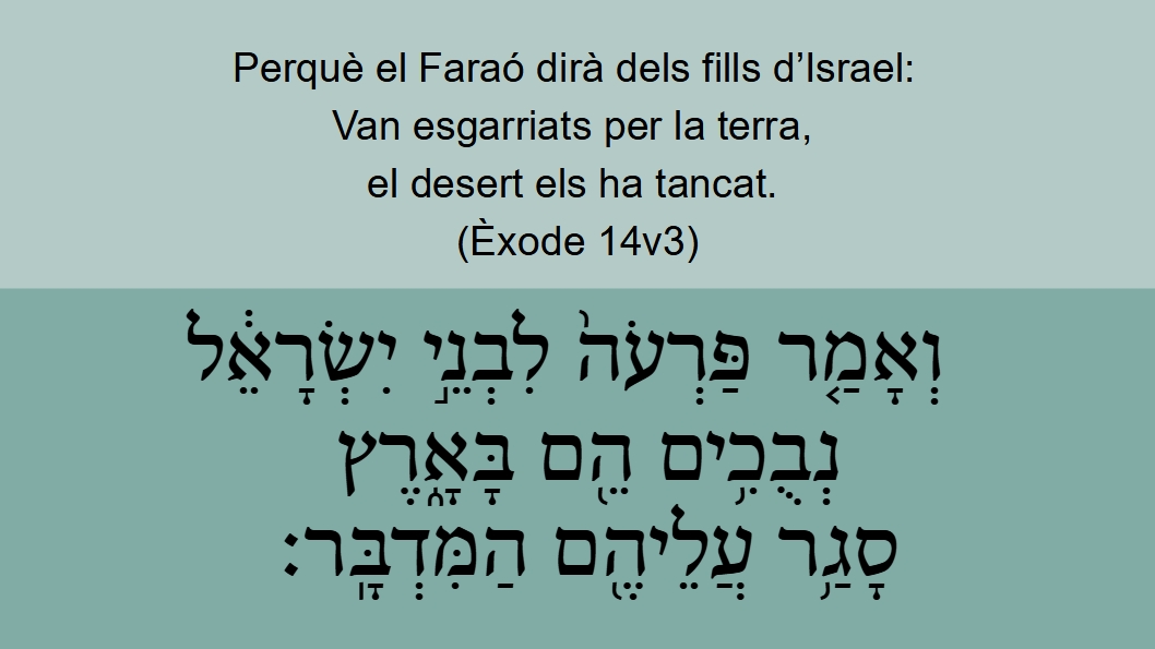 Èxode 14v3 Perquè el Faraó dirà dels fills d’Israel: Van esgarriats per la terra, el desert els ha tancat. וְאָמַ֤ר פַּרְעֹה֙ לִבְנֵ֣י יִשְׂרָאֵ֔ל נְבֻכִ֥ים הֵ֖ם בָּאָ֑רֶץ סָגַ֥ר עֲלֵיהֶ֖ם הַמִּדְבָּֽר׃ Farao dan zal zeggen van de kinderen Israels: Zij zijn verward in het land; die woestijn heeft hen besloten.GNV Èxode 14v3 For Pharaoh will say of the children of Israel, They are tangled in the land: the wildernesse hath shut them in. For Pharaoh will say of the children of Israel, They are entangled in the land, the wilderness hath shut them in.BCI Èxode 14v3 El faraó pensarà que els israelites van perduts pel país i que el desert els ha barrat el pas.CCC Èxode 14v3 Perquè el Faraó dirà dels fills d’Israel: Van esgarriats per la terra, el desert els ha tancat.