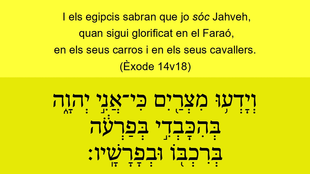 Èxode 14v18 I els egipcis sabran que jo sóc Jahveh, quan sigui glorificat en el Faraó, en els seus carros i en els seus cavallers. וְיָדְע֥וּ מִצְרַ֖יִם כִּי־אֲנִ֣י יְהוָ֑ה בְּהִכָּבְדִ֣י בְּפַרְעֹ֔ה בְּרִכְבּ֖וֹ וּבְפָרָשָֽׁיו׃ En de Egyptenaars zullen weten, dat Ik de HEERE ben, wanneer Ik verheerlijkt zal worden aan Farao, aan zijn wagenen en aan zijn ruiteren.GNV Èxode 14v18 Then the Egyptians shall know that I am the Lord, when I haue gotten me honour vpon Pharaoh, vpon his charets, and vpon his horsemen. And the Egyptians shall know that I am the LORD, when I have gotten me honour upon Pharaoh, upon his chariots, and upon his horsemen.BCI Èxode 14v18 I quan hauré manifestat la meva glòria vencent el faraó, els seus carros i els seus guerrers, els egipcis sabran que jo sóc el Senyor.»CCC Èxode 14v18 I els egipcis sabran que jo sóc Jahveh, quan sigui glorificat en el Faraó, en els seus carros i en els seus cavallers.