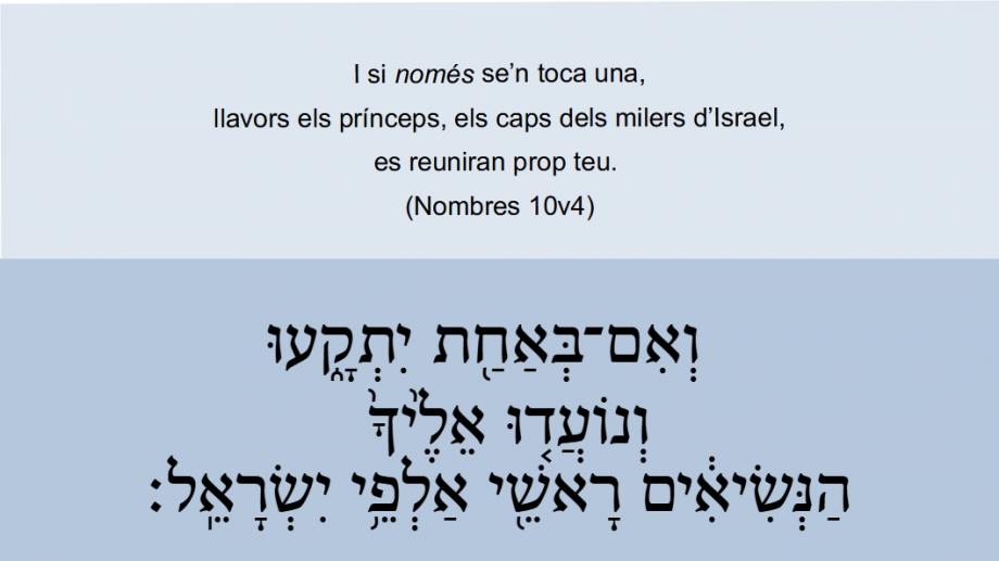 Nombres 10v4 I si només se’n toca una, llavors els prínceps, els caps dels milers d’Israel, es reuniran prop teu.  וְאִם־בְּאַחַ֖ת יִתְקָ֑עוּ וְנוֹעֲד֤וּ אֵלֶ֙יךָ֙ הַנְּשִׂיאִ֔ים רָאשֵׁ֖י אַלְפֵ֥י יִשְׂרָאֵֽל׃   ἐὰν δὲ ἐν μιᾷ σαλπίσωσιν προσελεύσονται πρ
