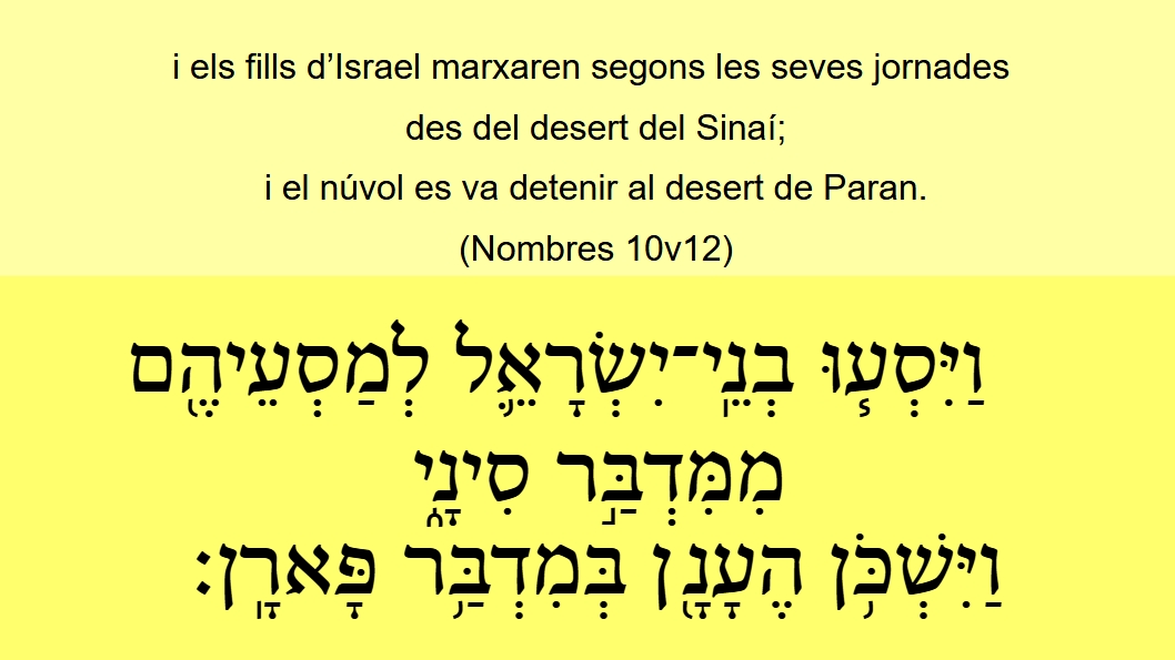 Nombres 10v12 i els fills d’Israel marxaren segons les seves jornades des del desert del Sinaí; i el núvol es va detenir al desert de Paran. וַיִּסְע֧וּ בְנֵֽי־יִשְׂרָאֵ֛ל לְמַסְעֵיהֶ֖ם מִמִּדְבַּ֣ר סִינָ֑י וַיִּשְׁכֹּ֥ן הֶעָנָ֖ן בְּמִדְבַּ֥ר פָּארָֽן׃ SVV Nombres 10v12 En de kinderen Israels togen op, naar hun tochten, uit de woestijn Sinai; en de wolk bleef in de woestijn Paran.And the children of Israel took their journeys out of the wilderness of Sinai; and the cloud rested in the wilderness of Paran.And the children of Israel took their journeys out of the wilderness of Sinai; and the cloud rested in the wilderness of Paran.LXT Nombres 10v12 καὶ ἐξῆραν οἱ υἱοὶ Ισραηλ σὺν ἀπαρτίαις αὐτῶν ἐν τῇ ἐρήμῳ Σινα καὶ ἔστη ἡ νεφέλη ἐν τῇ ἐρήμῳ τοῦ ΦαρανBCI Nombres 10v12 Llavors els israelites van partir del desert del Sinaí, seguint l'ordre de marxa establert. El núvol s'aturà al desert de Paran.