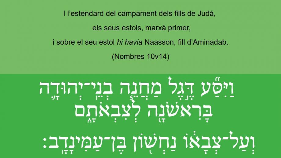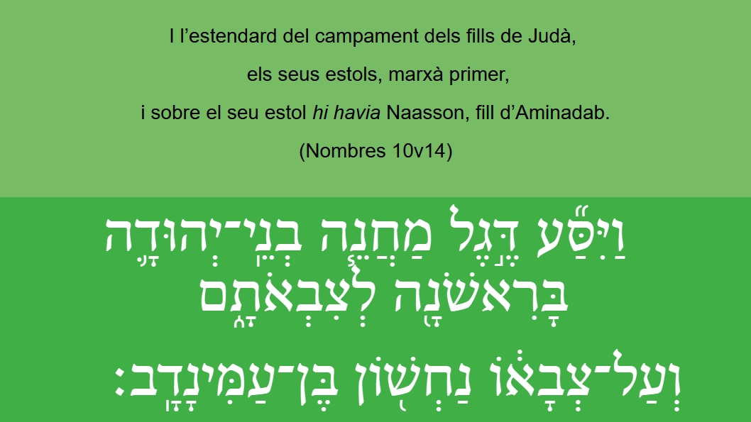 Nombres 10v14 I l’estendard del campament dels fills de Judà, segons els seus estols, marxà primer, i sobre el seu estol hi havia Naasson, fill d’Aminadab. וַיִּסַּ֞ע דֶּ֣גֶל מַחֲנֵ֧ה בְנֵֽי־יְהוּדָ֛ה בָּרִאשֹׁנָ֖ה לְצִבְאֹתָ֑ם וְעַל־צְבָא֔וֹ נַחְשׁ֖וֹן בֶּן־עַמִּינָדָֽב׃ Want vooreerst toog op de banier van het leger der kinderen van Juda, naar hun heiren; en over zijn heir was Nahesson, de zoon van Amminadab.In the first place went the standard of the camp of the children of Judah according to their armies: and over his host was Nahshon the son of Amminadab.In the first place went the standard of the camp of the children of Judah according to their armies: and over his host was Nahshon the son of Amminadab.LXT Nombres 10v14 καὶ ἐξῆραν τάγμα παρεμβολῆς υἱῶν Ιουδα πρῶτοι σὺν δυνάμει αὐτῶν καὶ ἐπὶ τῆς δυνάμεως αὐτῶν Ναασσων υἱὸς ΑμιναδαβBCI Nombres 10v14 Van partir en primer lloc els batallons agrupats al voltant de l'estendard del campament de Judà, a les ordres de Nahxon, fill d'Amminadab.