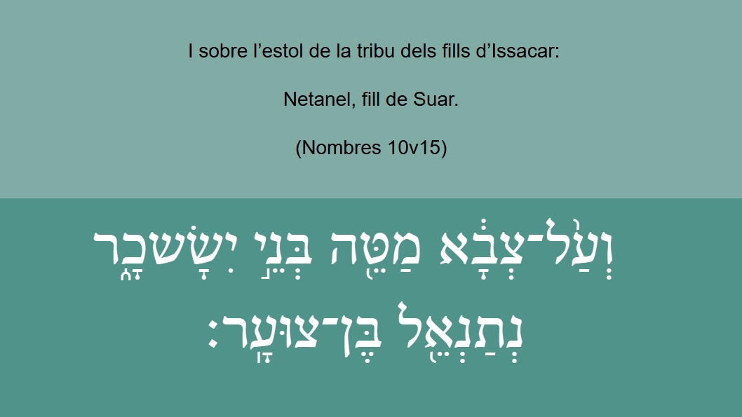 Nombres 10v15 I sobre l’estol de la tribu dels fills d’Issacar: Netanel, fill de Suar. וְעַ֙ל־צְבָ֔א מַטֵּ֖ה בְּנֵ֣י יִשָׂשכָ֑ר נְתַנְאֵ֖ל בֶּן־צוּעָֽר׃ En over het heir van den stam der kinderen van Issaschar was Nethaneel, den zoon van Zuar. And over the host of the tribe of the children of Issachar was Nethaneel the son of Zuar.KJV Nombres 10:15 And over the host of the tribe of the children of Issachar was Nethaneel the son of Zuar.LXT Nombres 10:15 καὶ ἐπὶ τῆς δυνάμεως φυλῆς υἱῶν Ισσαχαρ Ναθαναηλ υἱὸς ΣωγαρBCI Nombres 10:15 Els acompanyaven els de la tribu d'Issacar, a les ordres de Netanel, fill de Suar,__________________________________________0-CCC Nombres 10v15 I sobre l’estol de la tribu dels fills d’Issacar: Netanel, fill de Suar. WTT Nombres 10v15 וְעַ֙ל־צְבָ֔א מַטֵּ֖ה בְּנֵ֣י יִשָׂשכָ֑ר נְתַנְאֵ֖ל בֶּן־צוּעָֽר׃ SVV Nombres 10v15 En over het heir van den stam der kinderen van Issaschar was Nethaneel, den zoon van Zuar. And over the host of the tribe of the children of Issachar was Nethaneel the son of Zuar.KJV Nombres 10v15 And over the host of the tribe of the children of Issachar was Nethaneel the son of Zuar.LXA Nombres 10v15 And over the host of the tribe of the sons of Issachar, was Nathanael son of Sogar.LXT Nombres 10v15 καὶ ἐπὶ τῆς δυνάμεως φυλῆς υἱῶν Ισσαχαρ Ναθαναηλ υἱὸς ΣωγαρBCI Nombres 10v15 Els acompanyaven els de la tribu d'Issacar, a les ordres de Netanel, fill de Suar,LXE Nombres 10v15 And over the host of the tribe of the sons of Issachar, was Nathanael son of Sogar.