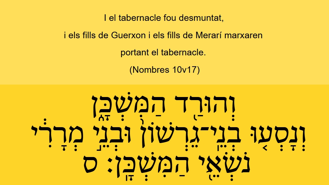 Nombres 10v17 I el tabernacle fou desmuntat, i els fills de Guerxon i els fills de Merarí marxaren portant el tabernacle. וְהוּרַ֖ד הַמִּשְׁכָּ֑ן וְנָסְע֤וּ בְנֵֽי־גֵרְשׁוֹן֙ וּבְנֵ֣י מְרָרִ֔י נֹשְׂאֵ֖י הַמִּשְׁכָּֽן׃ ס SVV Nombres 10v17 Toen werd de tabernakel afgenomen, en de zonen van Gerson, en de zonen van Merari togen op, dragende den tabernakel.And the tabernacle was taken down; and the sons of Gershon and the sons of Merari set forward, bearing the tabernacle.And the tabernacle was taken down; and the sons of Gershon and the sons of Merari set forward, bearing the tabernacle.LXT Nombres 10v17 καὶ καθελοῦσιν τὴν σκηνὴν καὶ ἐξαροῦσιν οἱ υἱοὶ Γεδσων καὶ οἱ υἱοὶ Μεραρι αἴροντες τὴν σκηνήνLXE Nombres 10v17 And they shall take down the tabernacle, and the sons of Gedson shall set forward, and the sons of Merari, who bear the tabernacle.BCI Nombres 10v17 Un cop desmuntat el tabernacle, els levites descendents de Guerxon i de Merarí, encarregats de transportar-lo, van posar-se en marxa.