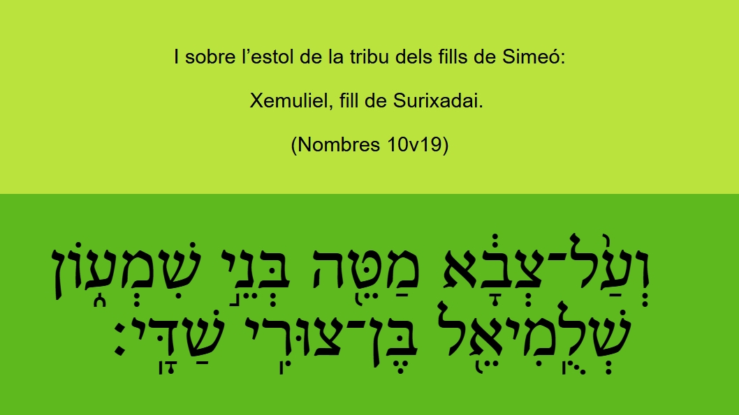 Nombres 10v19 I sobre l’estol de la tribu dels fills de Simeó: Xemuliel, fill de Surixadai. וְעַ֙ל־צְבָ֔א מַטֵּ֖ה בְּנֵ֣י שִׁמְע֑וֹן שְׁלֻֽמִיאֵ֖ל בֶּן־צוּרִֽי שַׁדָּֽי׃ En over het heir van den stam der kinderen van Simeon was Selumiel, de zoon van Zurisaddai.And over the host of the tribe of the children of Simeon was Shelumiel the son of Zurishaddai. And over the host of the tribe of the children of Simeon was Shelumiel the son of Zurishaddai.LXT Nombres 10v19 καὶ ἐπὶ τῆς δυνάμεως φυλῆς υἱῶν Συμεων Σαλαμιηλ υἱὸς ΣουρισαδαιLXE Nombres 10v19 And over the host of the tribe of the sons of Symeon, was Salamiel son of Surisadai.BCI Nombres 10v19 Els acompanyaven els de la tribu de Simeó, a les ordres de Xelumiel, fill de Surixadai,