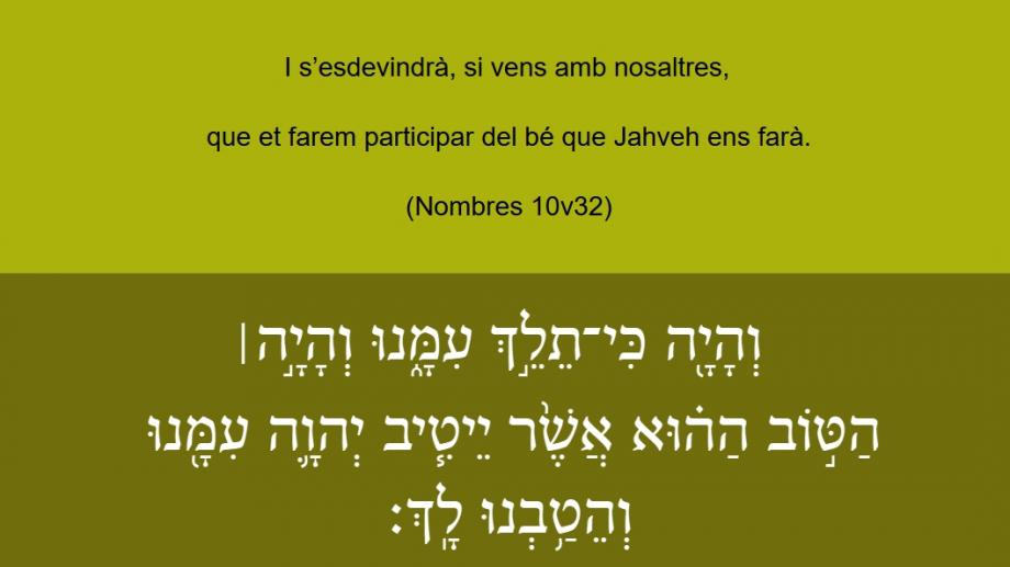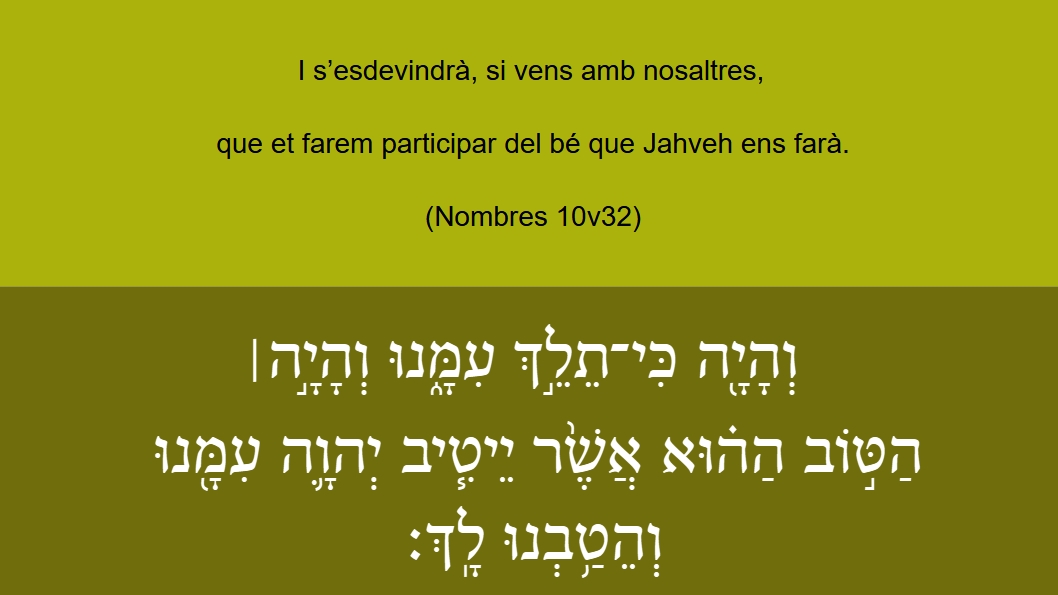 Nombres 10v32 I s’esdevindrà, si vens amb nosaltres, que et farem participar del bé que Jahveh ens farà. וְהָיָ֖ה כִּי־תֵלֵ֣ךְ עִמָּ֑נוּ וְהָיָ֣ה׀ הַטּ֣וֹב הַה֗וּא אֲשֶׁ֙ר יֵיטִ֧יב יְהוָ֛ה עִמָּ֖נוּ וְהֵטַ֥בְנוּ לָֽךְ׃ And if thou go with vs, what goodnes the Lord shall shew vnto vs, the same will we shewe vnto thee.LXT Nombres 10v32 καὶ ἔσται ἐὰν πορευθῇς μεθ᾽ ἡμῶν καὶ ἔσται τὰ ἀγαθὰ ἐκεῖνα ὅσα ἐὰν ἀγαθοποιήσῃ κύριος ἡμᾶς καὶ εὖ σε ποιήσομενLXE Nombres 10v32 And it shall come to pass if thou wilt go with us, it shall even come to pass that in whatsoever things the Lord shall do us good, we will also do thee good.