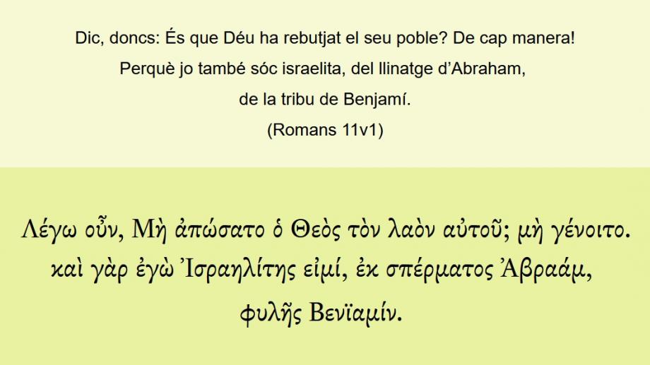 Romans 11v1 Dic, doncs: És que Déu ha rebutjat el seu poble? De cap manera! Perquè jo també sóc israelita, del llinatge d’Abraham, de la tribu de Benjamí. Λέγω οὖν, Μὴ ἀπώσατο ὁ Θεὸς τὸν λαὸν αὐτοῦ; μὴ γένοιτο. καὶ γὰρ ἐγὼ Ἰσραηλίτης εἰμί, ἐκ σπέρματος Ἀβραάμ, φυλῆς Βενϊαμίν.