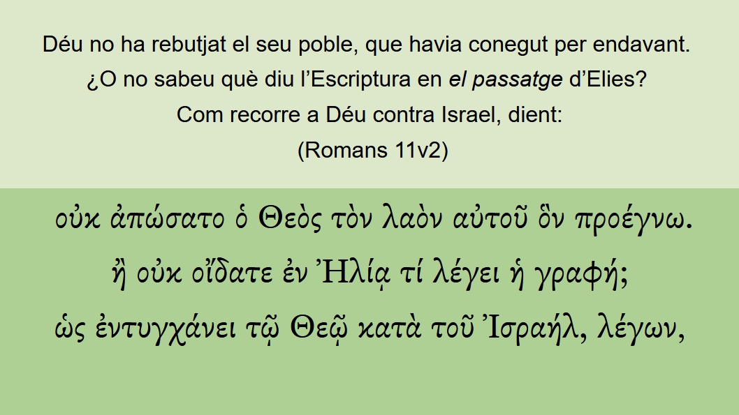 Romans 11v2 Déu no ha rebutjat el seu poble, que havia conegut per endavant. ¿O no sabeu què diu l’Escriptura en el passatge d’Elies? Com recorre a Déu contra Israel, dient:οὐκ ἀπώσατο ὁ Θεὸς τὸν λαὸν αὐτοῦ ὃν προέγνω. ἢ οὐκ οἴδατε ἐν Ἠλίᾳ τί λέγει ἡ γραφή; ὡς ἐντυγχάνει τῷ Θεῷ κατὰ τοῦ Ἰσραήλ, λέγων,CCC-ConcordançaRomans 11v2 Déu no ha rebutjat el seu poble, que havia conegut per endavant. ¿O no sabeu què diu l’Escriptura en [el passatge] d’Elies? Com recorre a Déu contra Israel, dient: οὐκ ἀπώσατο ὁ Θεὸς τὸν λαὸν αὐτοῦ ὃν προέγνω. ἢ οὐκ οἴδατε ἐν Ἠλίᾳ τί λέγει ἡ γραφή; ὡς ἐντυγχάνει τῷ Θεῷ κατὰ τοῦ Ἰσραήλ, λέγων,