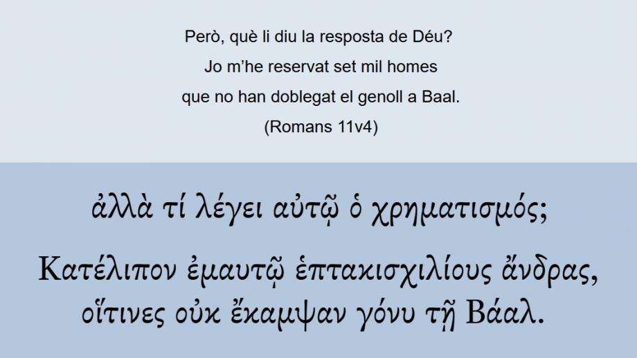 Romans 11v4 Però, què li diu la resposta de Déu? Jo m’he reservat set mil homes que no han doblegat el genoll a Baal. ἀλλὰ τί λέγει αὐτῷ ὁ χρηματισμός; Κατέλιπον ἐμαυτῷ ἑπτακισχιλίους ἄνδρας, οἵτινες οὐκ ἔκαμψαν γόνυ τῇ Βάαλ.