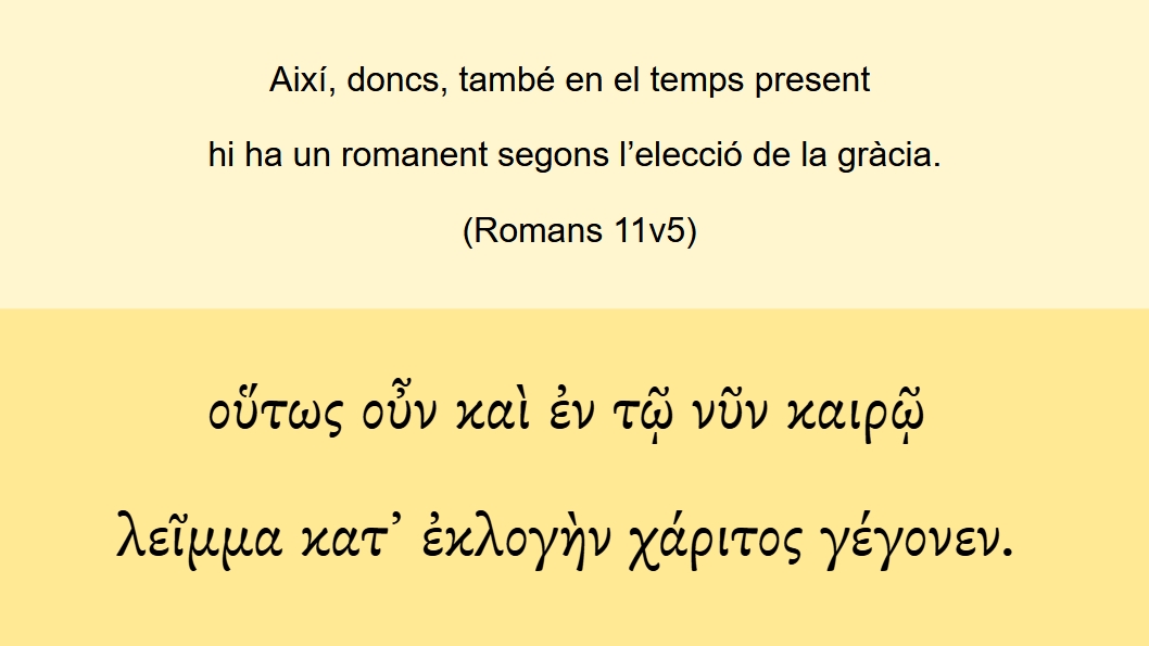 Romans 11v5 Així, doncs, també en el temps present hi ha un romanent segons l’elecció de la gràcia. οὕτως οὖν καὶ ἐν τῷ νῦν καιρῷ λεῖμμα κατ᾽ ἐκλογὴν χάριτος γέγονεν.