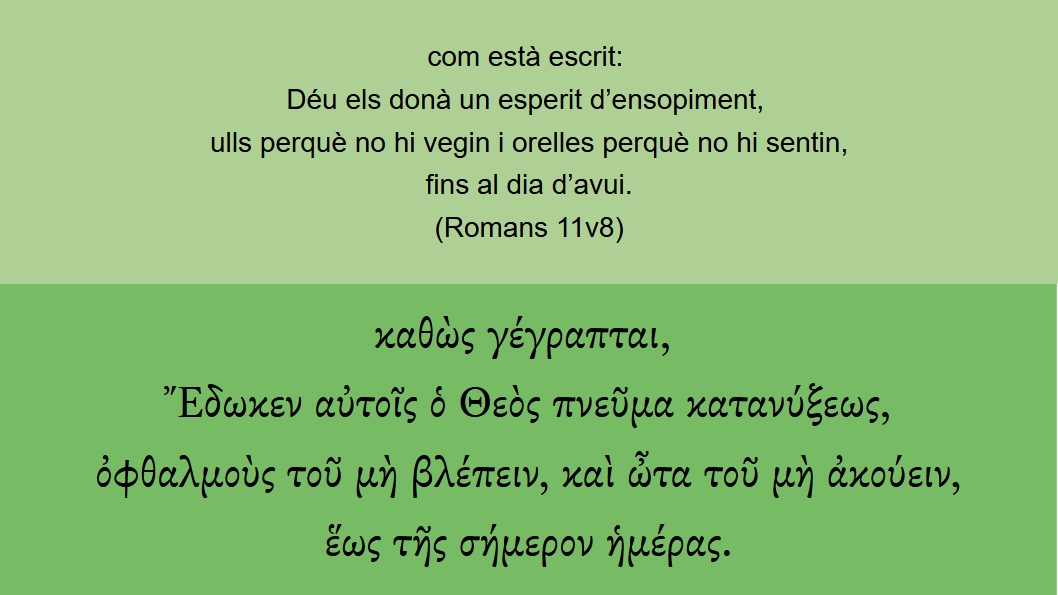 Romans 11v8 com està escrit: Déu els donà un esperit d’ensopiment, ulls perquè no hi vegin i orelles perquè no hi sentin, fins al dia d’avui. καθὼς γέγραπται, Ἔδωκεν αὐτοῖς ὁ Θεὸς πνεῦμα κατανύξεως, ὀφθαλμοὺς τοῦ μὴ βλέπειν, καὶ ὦτα τοῦ μὴ ἀκούειν, ἕως τῆς σήμερον ἡμέρας.