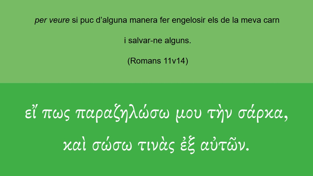 Romans 11v14 [per veure] si puc d’alguna manera fer engelosir els de la meva carn i salvar-ne alguns. εἴ πως παραζηλώσω μου τὴν σάρκα, καὶ σώσω τινὰς ἐξ αὐτῶν.