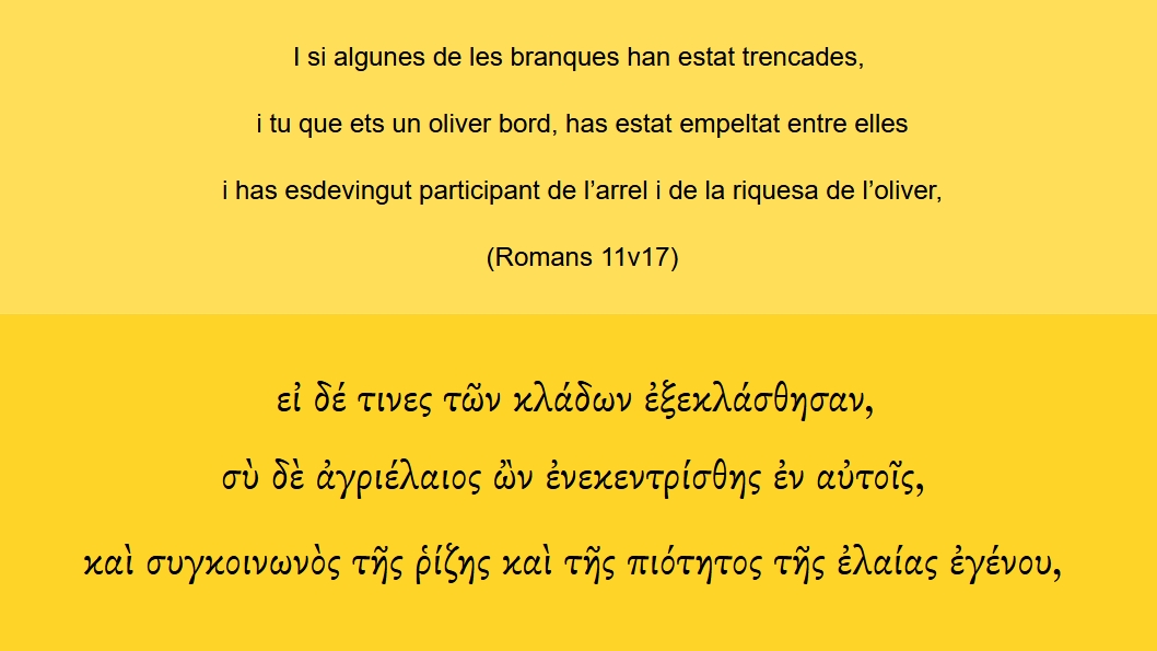 Romans 11v17 I si algunes de les branques han estat trencades, i tu que ets un oliver bord, has estat empeltat entre elles i has esdevingut participant de l’arrel i de la riquesa de l’oliver,  εἰ δέ τινες τῶν κλάδων ἐξεκλάσθησαν, σὺ δὲ ἀγριέλαιος ὢν ἐν