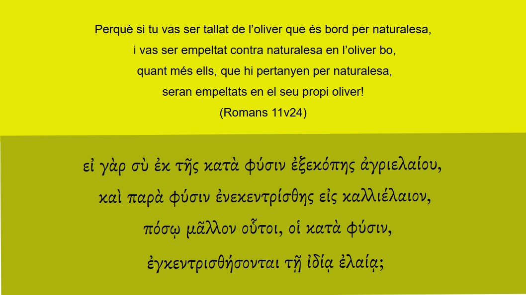 Romans 11v24 Perquè si tu vas ser tallat de l’oliver que és bord per naturalesa, i vas ser empeltat contra naturalesa en l’oliver bo, quant més ells, que hi pertanyen per naturalesa, seran empeltats en el seu propi oliver! εἰ γὰρ σὺ ἐκ τῆς κατὰ φύσιν ἐξεκόπης ἀγριελαίου, καὶ παρὰ φύσιν ἐνεκεντρίσθης εἰς καλλιέλαιον, πόσῳ μᾶλλον οὗτοι, οἱ κατὰ φύσιν, ἐγκεντρισθήσονται τῇ ἰδίᾳ ἐλαίᾳ;