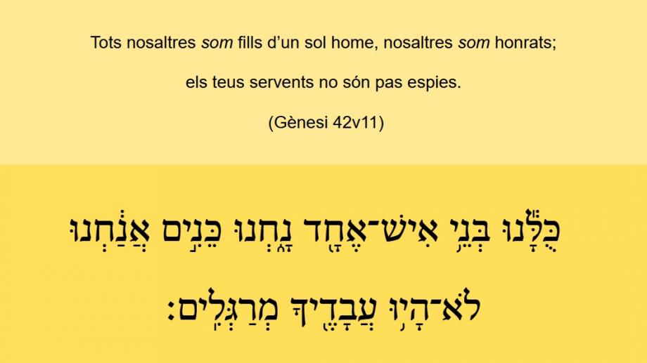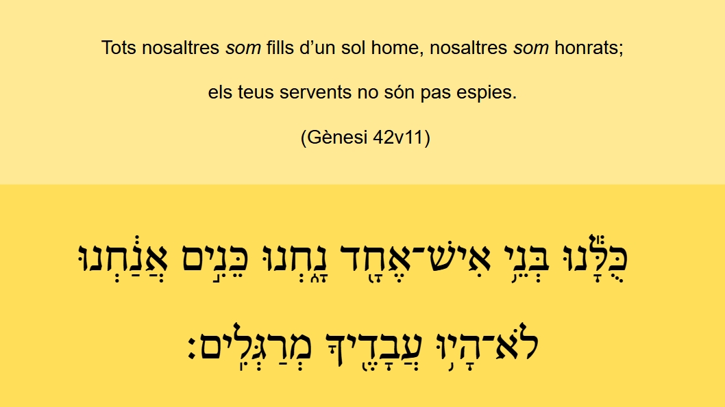 Gènesi 42v11 Tots nosaltres [som] fills d’un sol home, nosaltres [som] honrats; els teus servents no són pas espies. כֻּלָּ֕נוּ בְּנֵ֥י אִֽישׁ־אֶחָ֖דֿ נָ֑חְנוּ כֵּנִ֣ים אֲנַ֔חְנוּ לֹֽא־הָי֥וּ עֲבָֿדֶֿ֖יךָֿ מְרַגְּלִֽים׃ (Gn 42v11)
