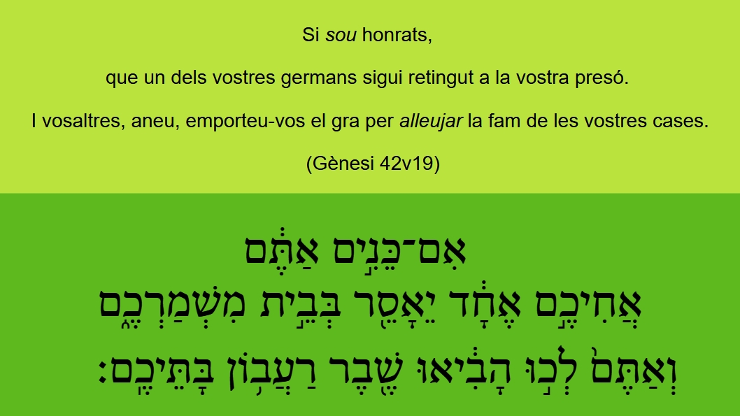 Gènesi 42v19 Si [sou] honrats, que un dels vostres germans sigui retingut a la vostra presó. I vosaltres, aneu, emporteu-vos el gra per [alleujar] la fam de les vostres cases. אִם־כֵּנִ֣ים אַתֶּ֔ם אֲחִיכֶֿ֣ם אֶחָ֔דֿ יֵֽאָסֵ֖ר בְּבֵֿ֣יתֿ מִשְׁמַרְכֶֿ֑ם וְאַתֶּם֙ לְכֿ֣וּ הָבִ֔יאוּ שֶׁ֖בֶֿר רַֽעֲבֿ֥וֹן בָּֽתֵּיכֶֽֿם׃ (Gn 42v19)