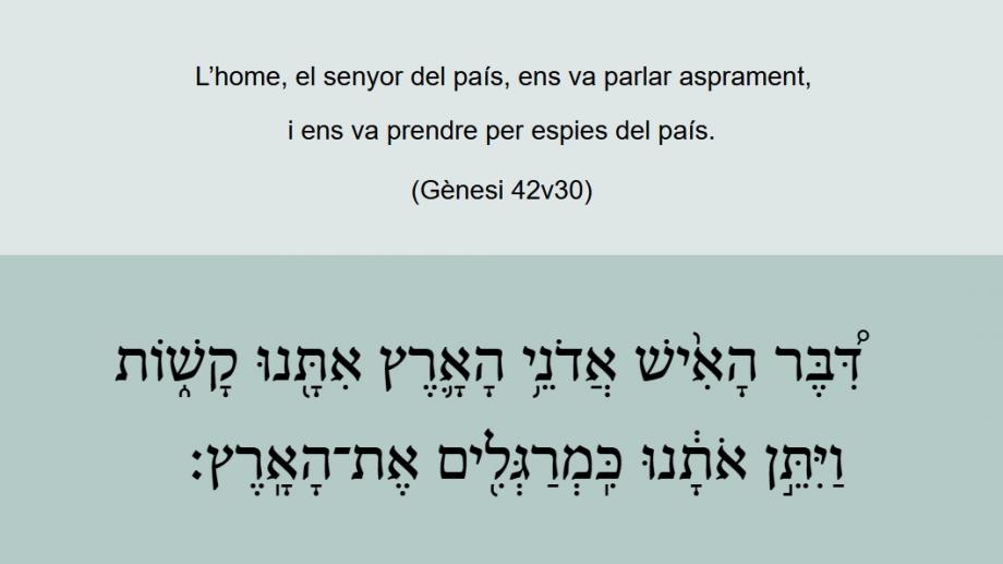 Gènesi 42v30 L’home, el senyor del país, ens va parlar asprament, i ens va prendre per espies del país. דִּ֠בֶּר הָאִ֨ישׁ אֲדֹֿנֵ֥י הָאָ֛רֶץ אִתָּ֖נוּ קָשׁ֑וֹתֿ וַיִּתֵּ֣ן אֹתָ֔נוּ כִּֽמְרַגְּלִ֖ים אֶתֿ־הָאָֽרֶץ׃ (Ge 42v30)