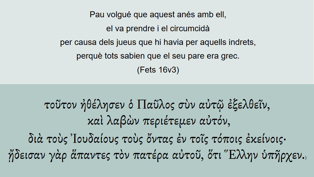 Fets 16v3 Pau volgué que aquest anés amb ell, el va prendre i el circumcidà per causa dels jueus que hi havia per aquells indrets, perquè tots sabien que el seu pare era grec. τοῦτον ἠθέλησεν ὁ Παῦλος σὺν αὐτῷ ἐξελθεῖν, καὶ λαβὼν περιέτεμεν αὐτόν, διὰ τοὺς Ἰουδαίους τοὺς ὄντας ἐν τοῖς τόποις ἐκείνοις· ᾔδεισαν γὰρ ἅπαντες τὸν πατέρα αὐτοῦ, ὅτι Ἕλλην ὑπῆρχεν.