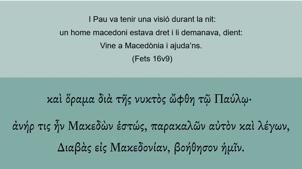 Fets 16v9 I Pau va tenir una visió durant la nit: un home macedoni estava dret i li demanava, dient: Vine a Macedònia i ajuda’ns. καὶ ὅραμα διὰ τῆς νυκτὸς ὤφθη τῷ Παύλῳ· ἀνήρ τις ἦν Μακεδὼν ἑστώς, παρακαλῶν αὐτὸν καὶ λέγων, Διαβὰς εἰς Μακεδονίαν, βοήθησον ἡμῖν.