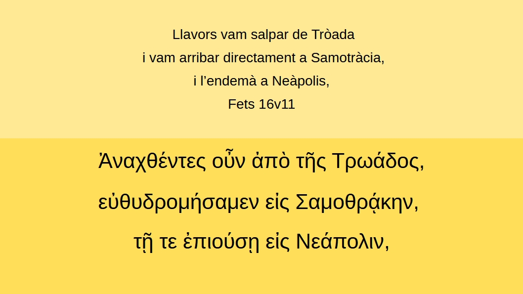 Fets 16v11 Llavors vam salpar de Tròada i vam arribar directament a Samotràcia, i l’endemà a Neàpolis, Ἀναχθέντες οὖν ἀπὸ τῆς Τρωάδος, εὐθυδρομήσαμεν εἰς Σαμοθρᾴκην, τῇ τε ἐπιούσῃ εἰς Νεάπολιν, (Ft 16v11)
