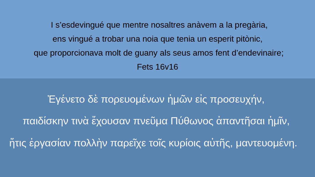 Fets 16v16 I s’esdevingué que mentre nosaltres anàvem a la pregària, ens vingué a trobar una noia que tenia un esperit pitònic, que proporcionava molt de guany als seus amos fent d’endevinaire; Ἐγένετο δὲ πορευομένων ἡμῶν εἰς προσευχήν, παιδίσκην τινὰ ἔχουσαν πνεῦμα Πύθωνος ἀπαντῆσαι ἡμῖν, ἥτις ἐργασίαν πολλὴν παρεῖχε τοῖς κυρίοις αὐτῆς, μαντευομένη. (Ft 16v16)