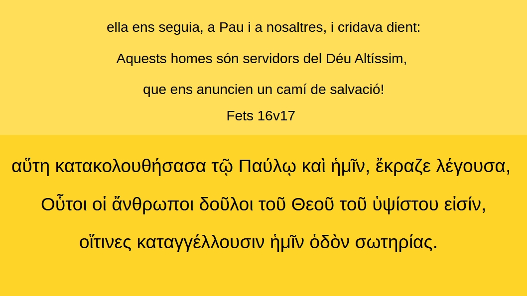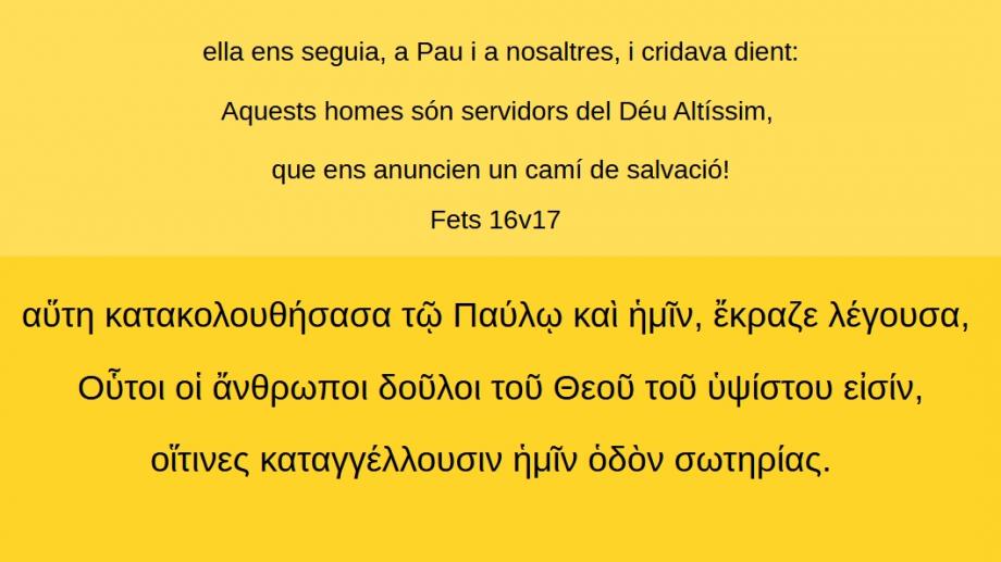 Fets 16v17 ella ens seguia, a Pau i a nosaltres, i cridava dient: Aquests homes són servidors del Déu Altíssim, que ens anuncien un camí de salvació! αὕτη κατακολουθήσασα τῷ Παύλῳ καὶ ἡμῖν, ἔκραζε λέγουσα, Οὗτοι οἱ ἄνθρωποι δοῦλοι τοῦ Θεοῦ τοῦ ὑψίστου εἰσίν, οἵτινες καταγγέλλουσιν ἡμῖν ὁδὸν σωτηρίας. (Ft 16v17)