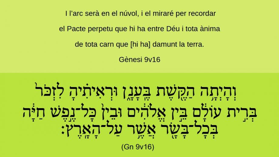 Gènesi 9v16 I l’arc serà en el núvol, i el miraré per recordar el Pacte perpetu que hi ha entre Déu i tota ànima de tota carn que [hi ha] damunt la terra.וְהָֽיְתָֿ֥הֿ הַקֶּ֖שֶׁתֿ בֶּֽעָנָ֑ן וּרְאִיתִ֗יהָ לִזְכֹּר֙ בְּרִ֣יתֿ עוֹלָ֔ם בֵּ֣ין אֱלֹהִ֔ים וּבֵֿין֙ כָּל־נֶ֣פֶֿשׁ חַיָּ֔הֿ בְּכָֿל־בָּשָׂ֖ר אֲשֶׁ֥ר עַל־הָאָֽרֶץ׃ (Gn 9v16)